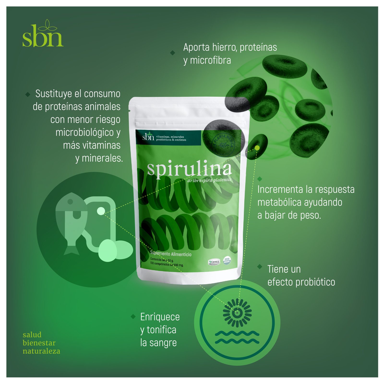 Beneficios: Tiene un efecto probiótico y sustituye el consumo de proteínas animales con menor riesgo microbiológico y más vitaminas y minerales. Enriquece y tonifica la sangre. Incrementa la respuesta metabólica ayudando a bajar de peso.